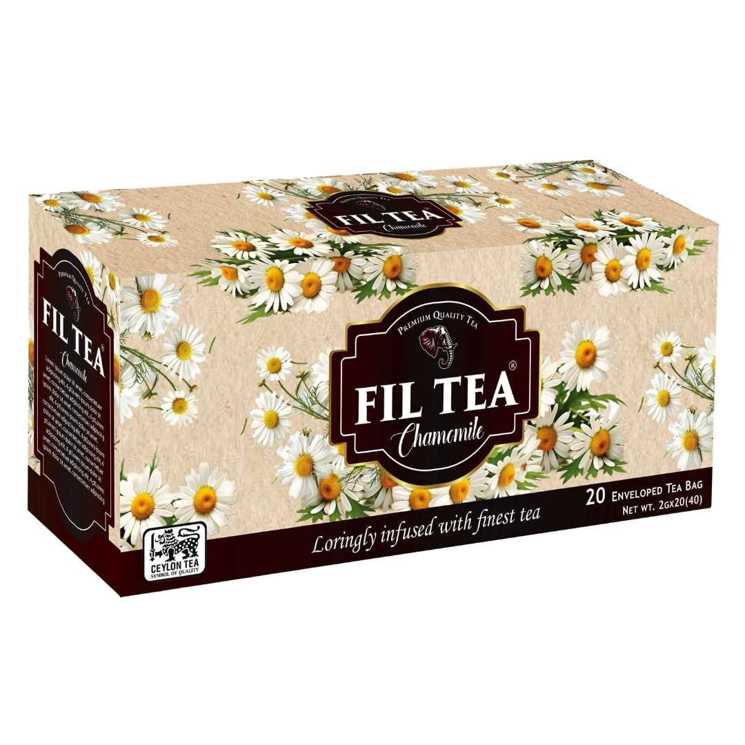 Discover a harmonious blend in FIL Tea Chamomile Flavoured Tea, where the robust essence of Pure Ceylon Black Tea is gracefully balanced by the gentle, soothing character of chamomile blossoms. Designed for simplicity, each string & tag tea bag is securely housed in a paper carton that preserves its pristine freshness. Offered in convenient 20-tea bag packs.